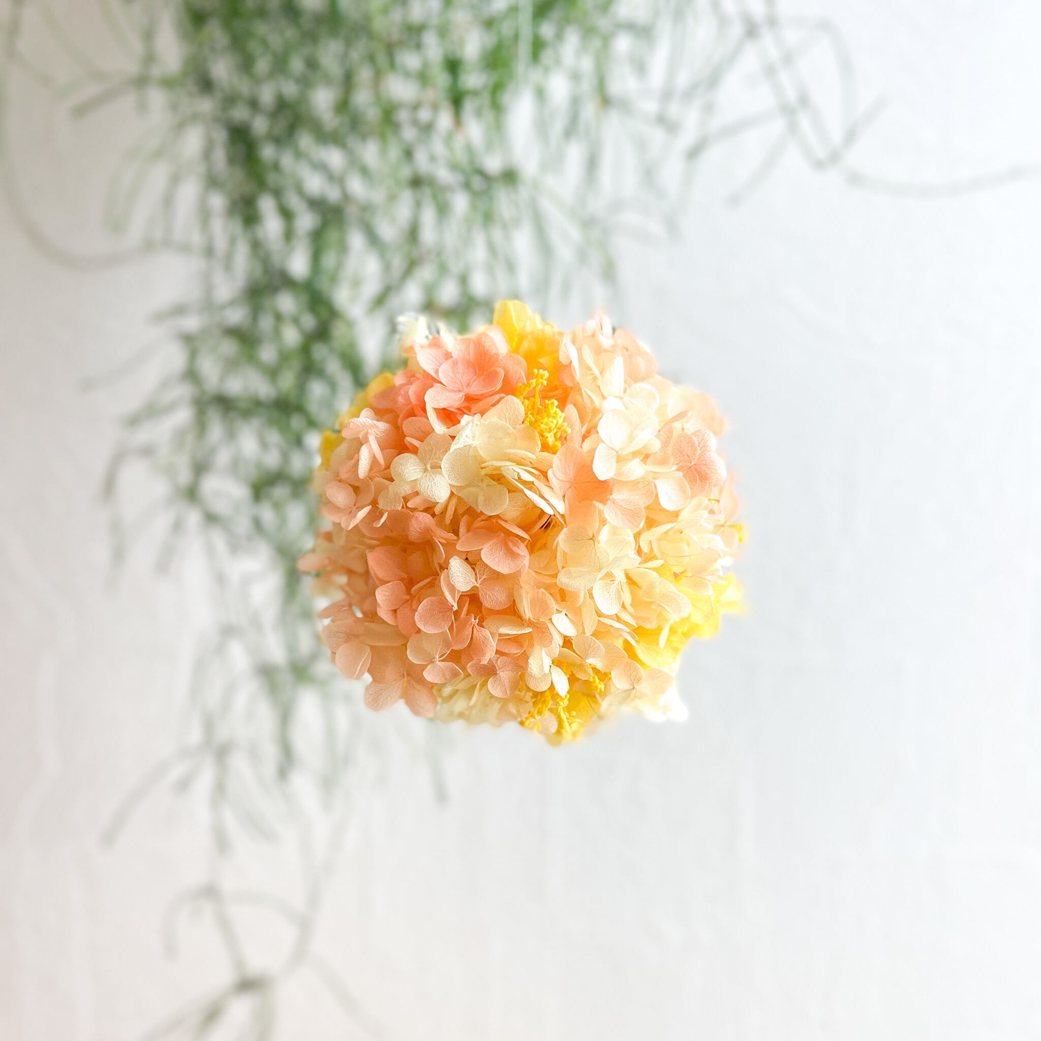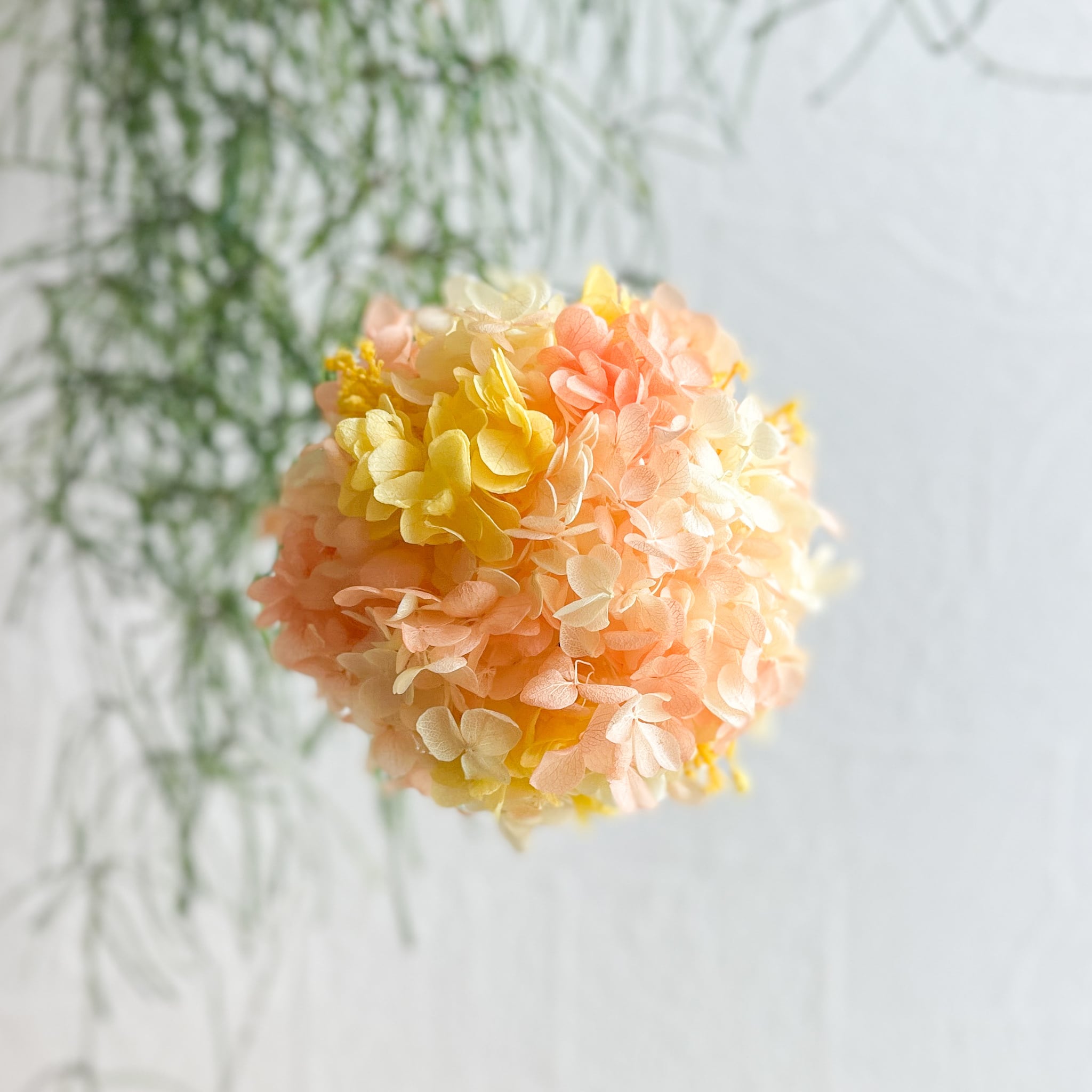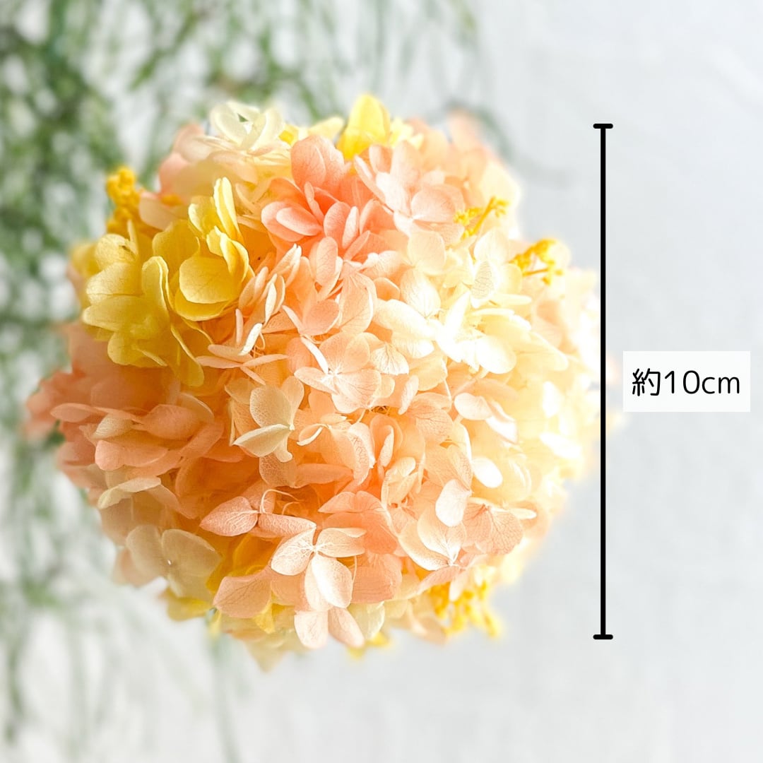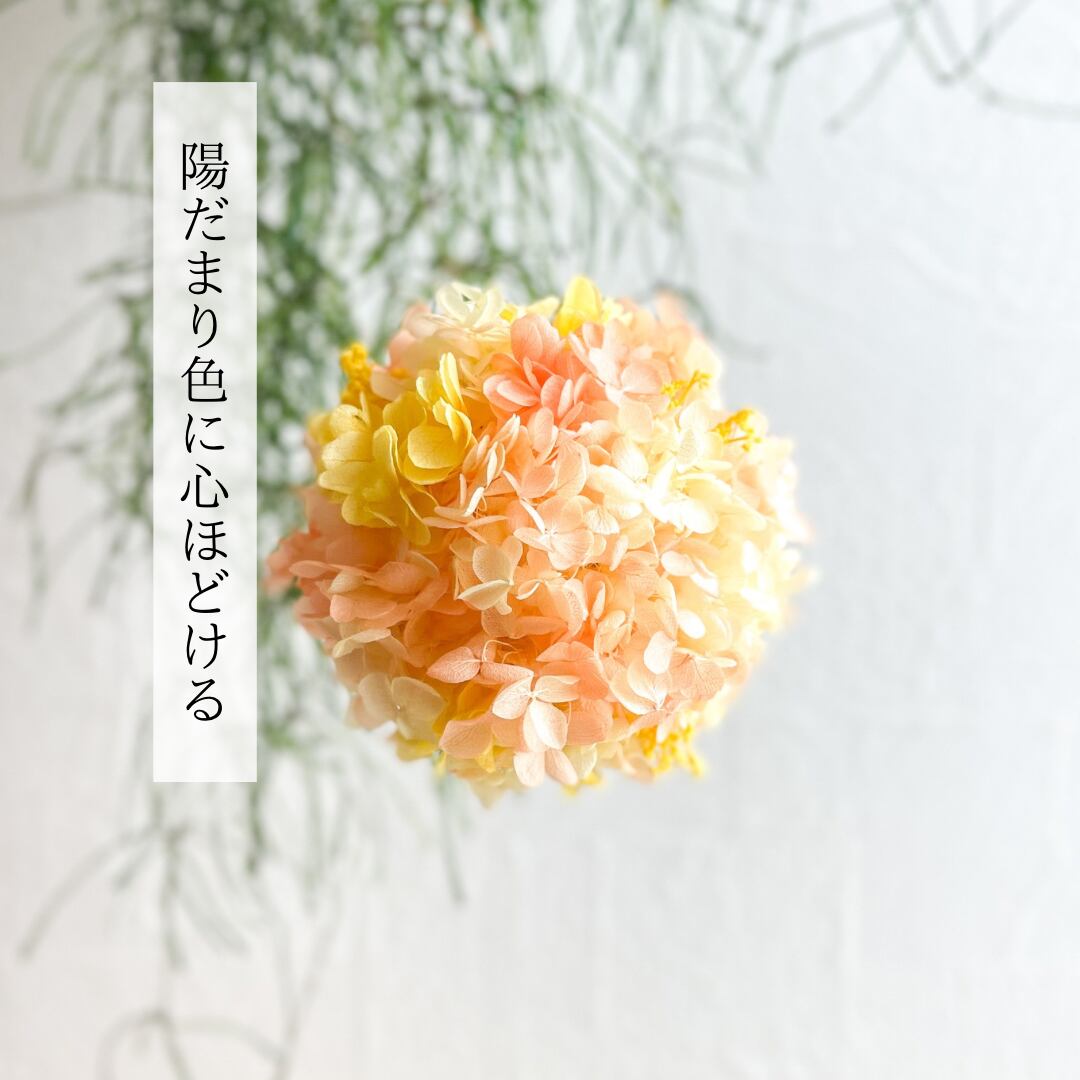 ふんわりと広がる淡いオレンジとイエローのグラデーションが心をやさしく照らす、プリザーブドフラワーのボールアレンジです。