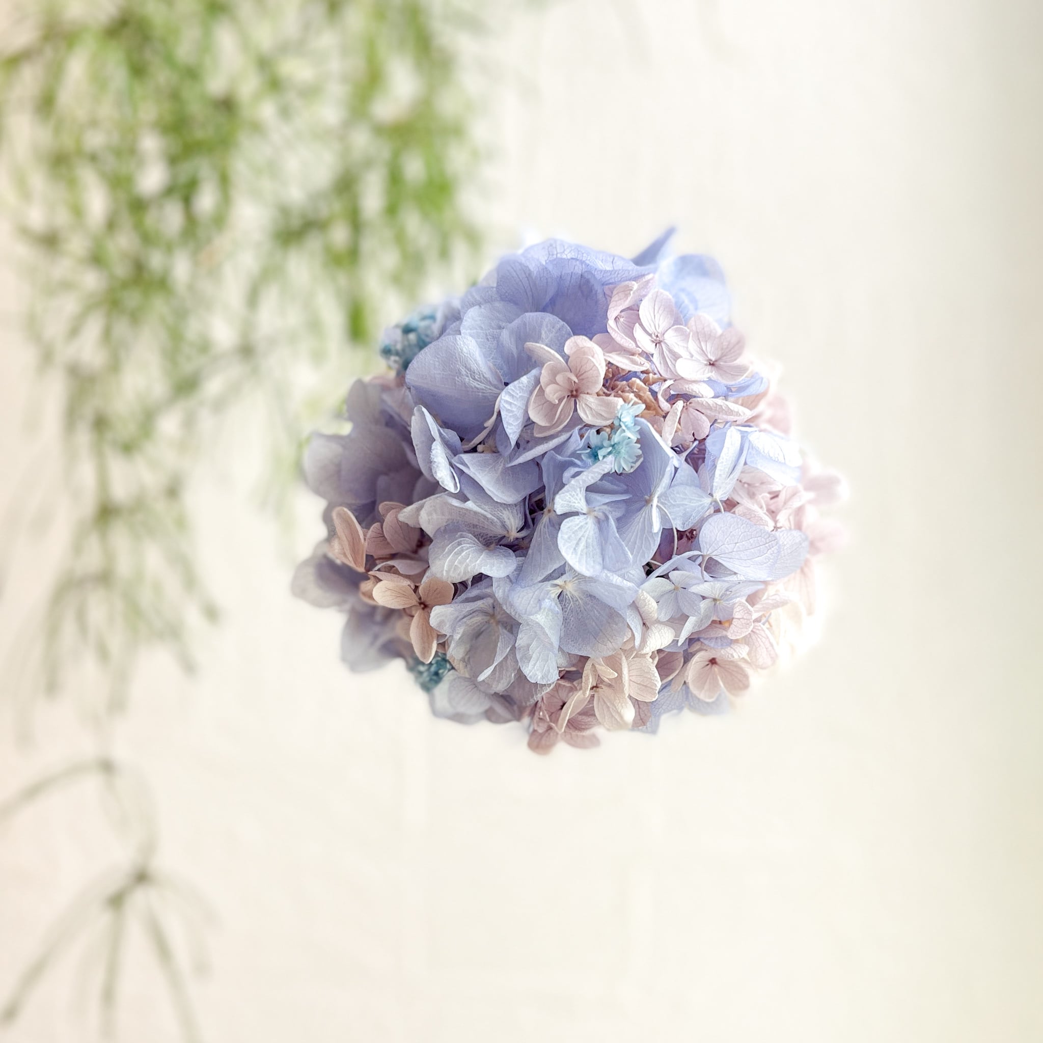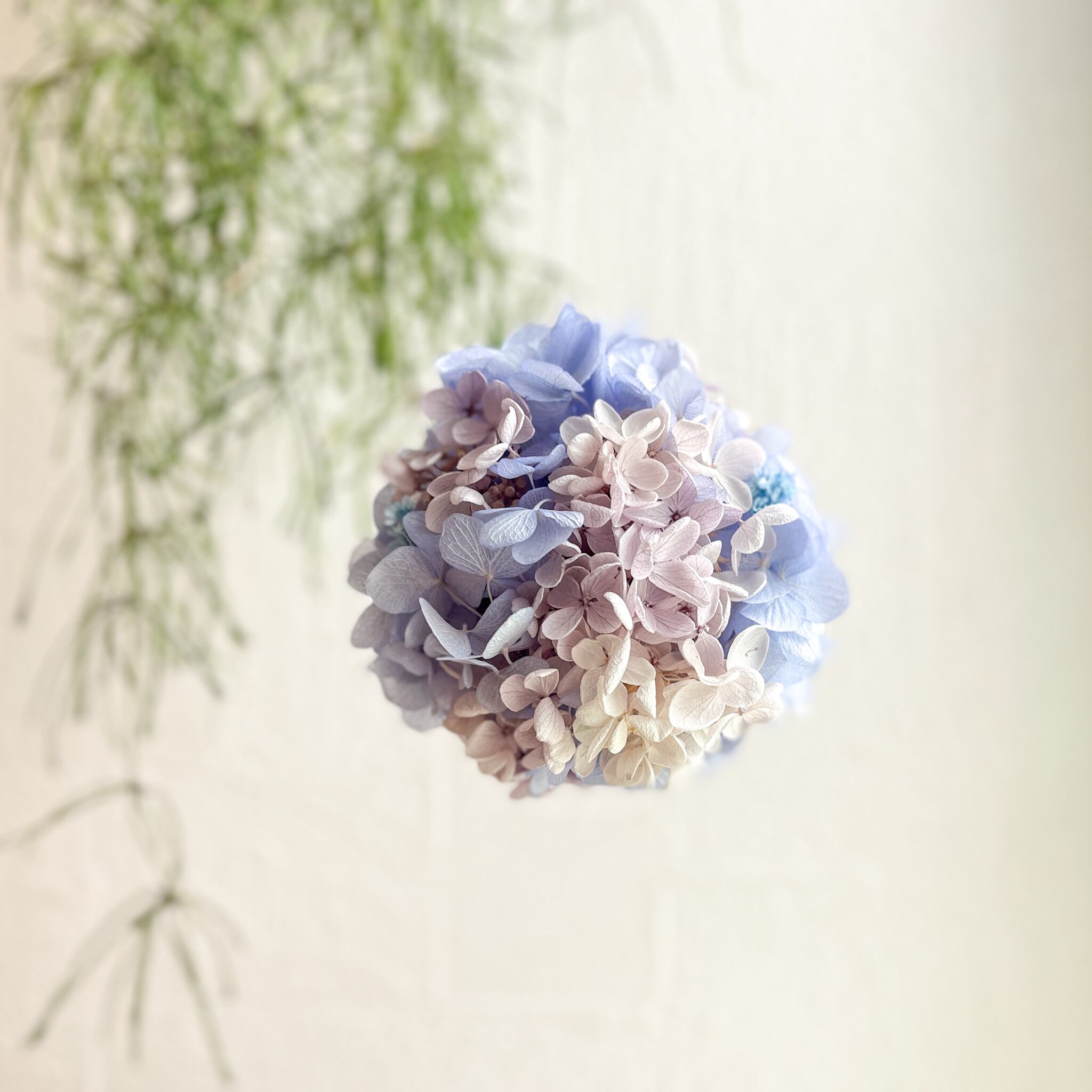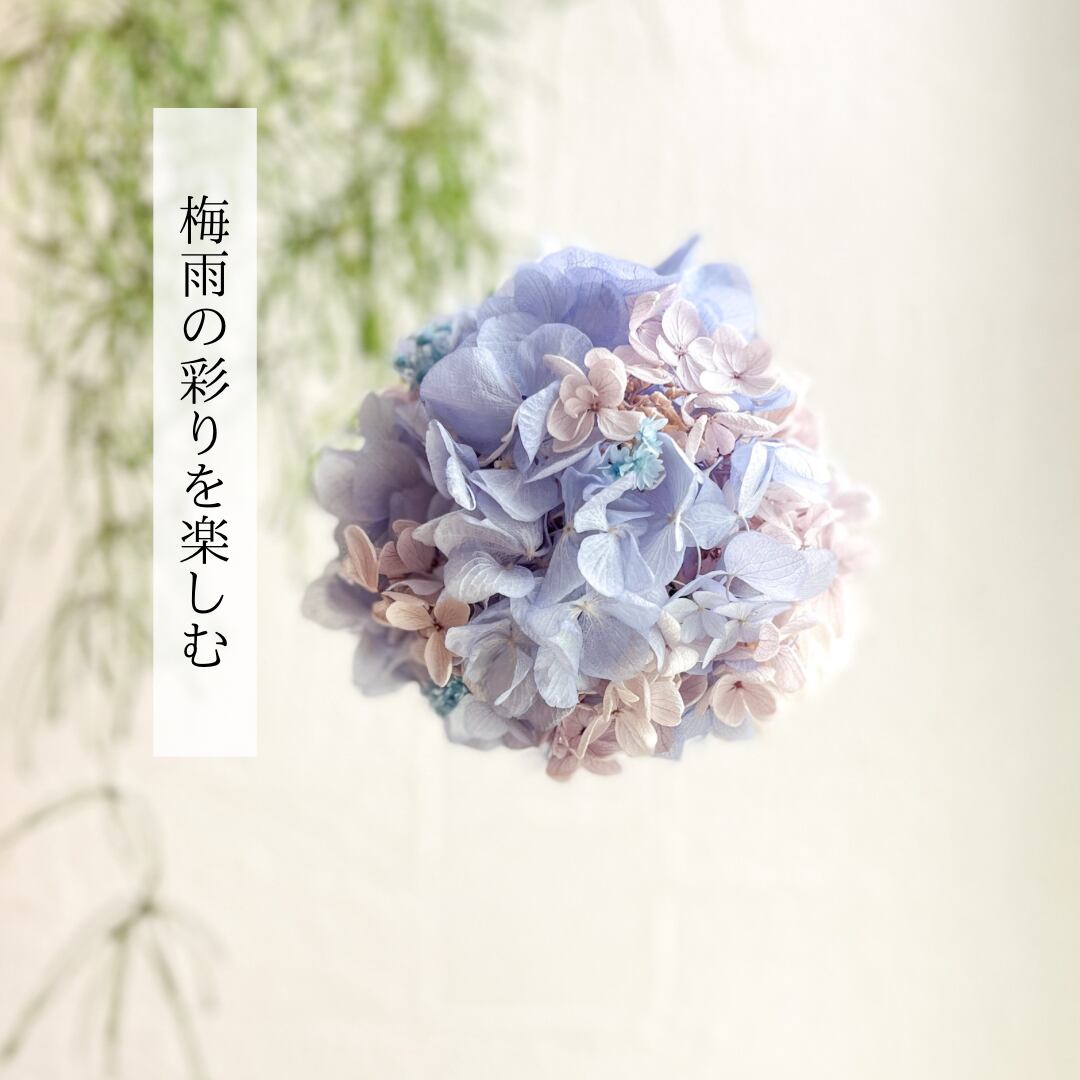 雨に濡れる紫陽花が美しい季節――梅雨の始まりをふんわりと彩る、プリザーブドフラワーのボール型アレンジメントです。