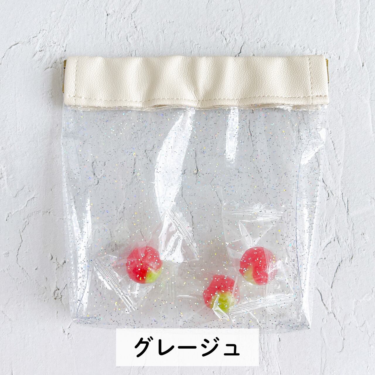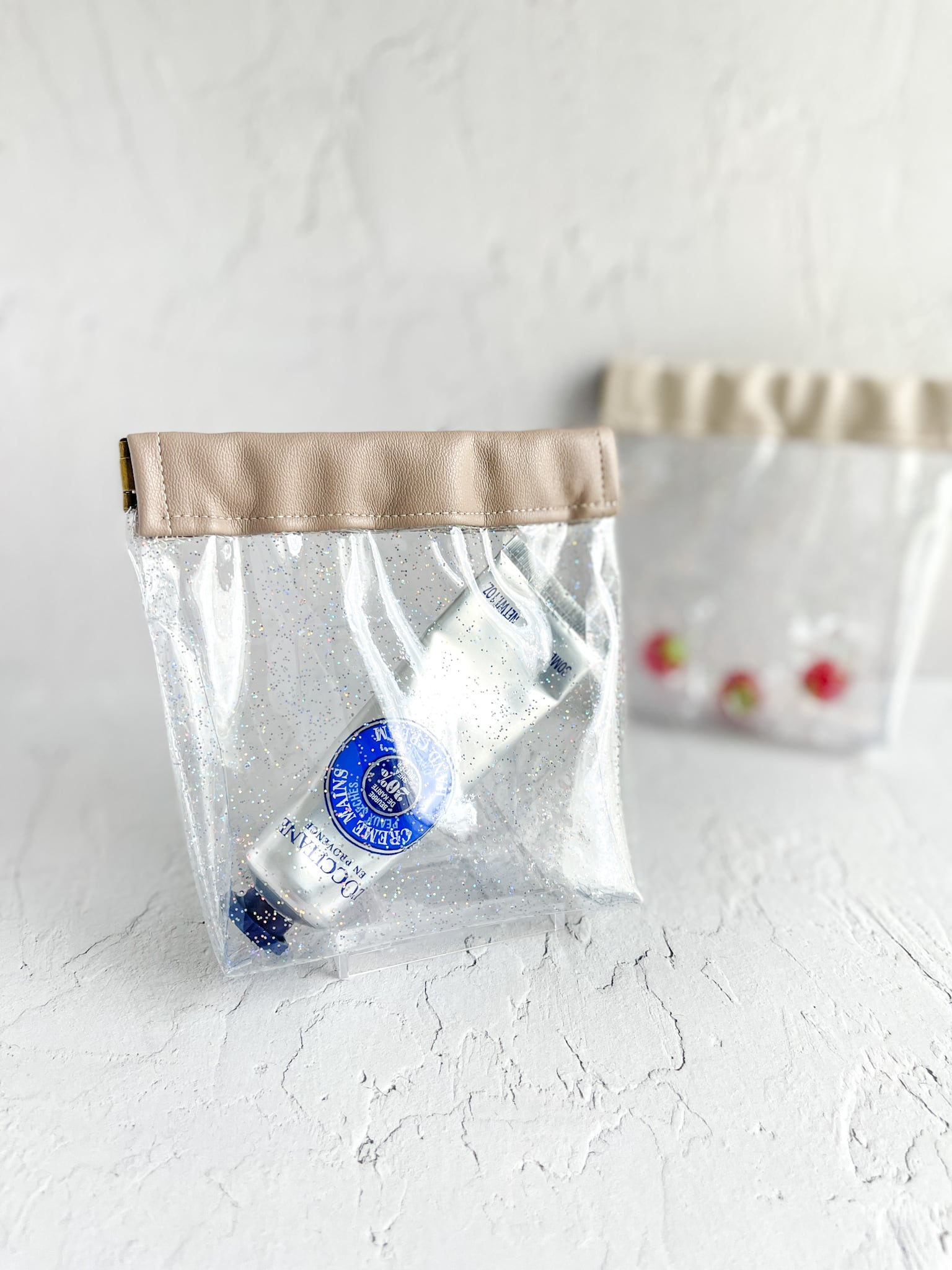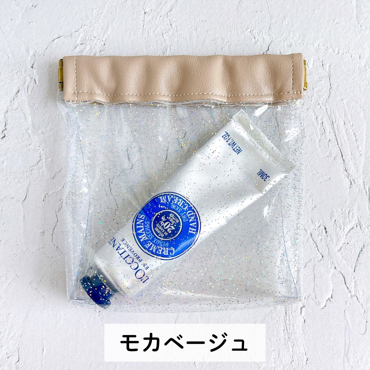 透明感のあるPVC素材に、きらりと光るラメを散りばめた上品なバネポーチです。