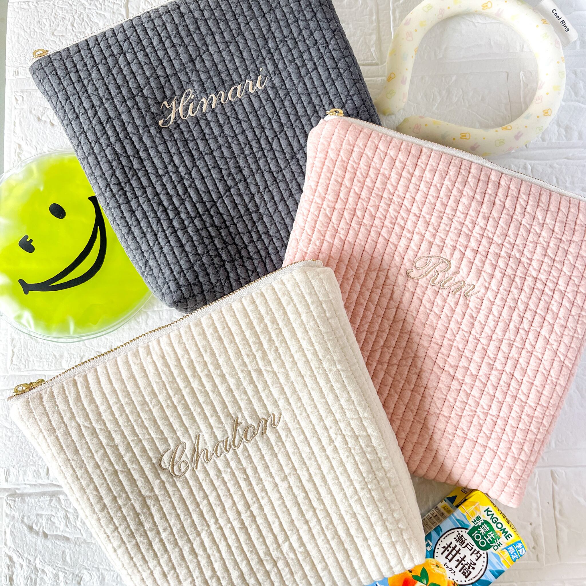 名入れ刺繍*やわらかヌビの保冷ポーチ オーダーメイド|アイスリング・ネッククーラー 保冷バッグ グレー ピンク