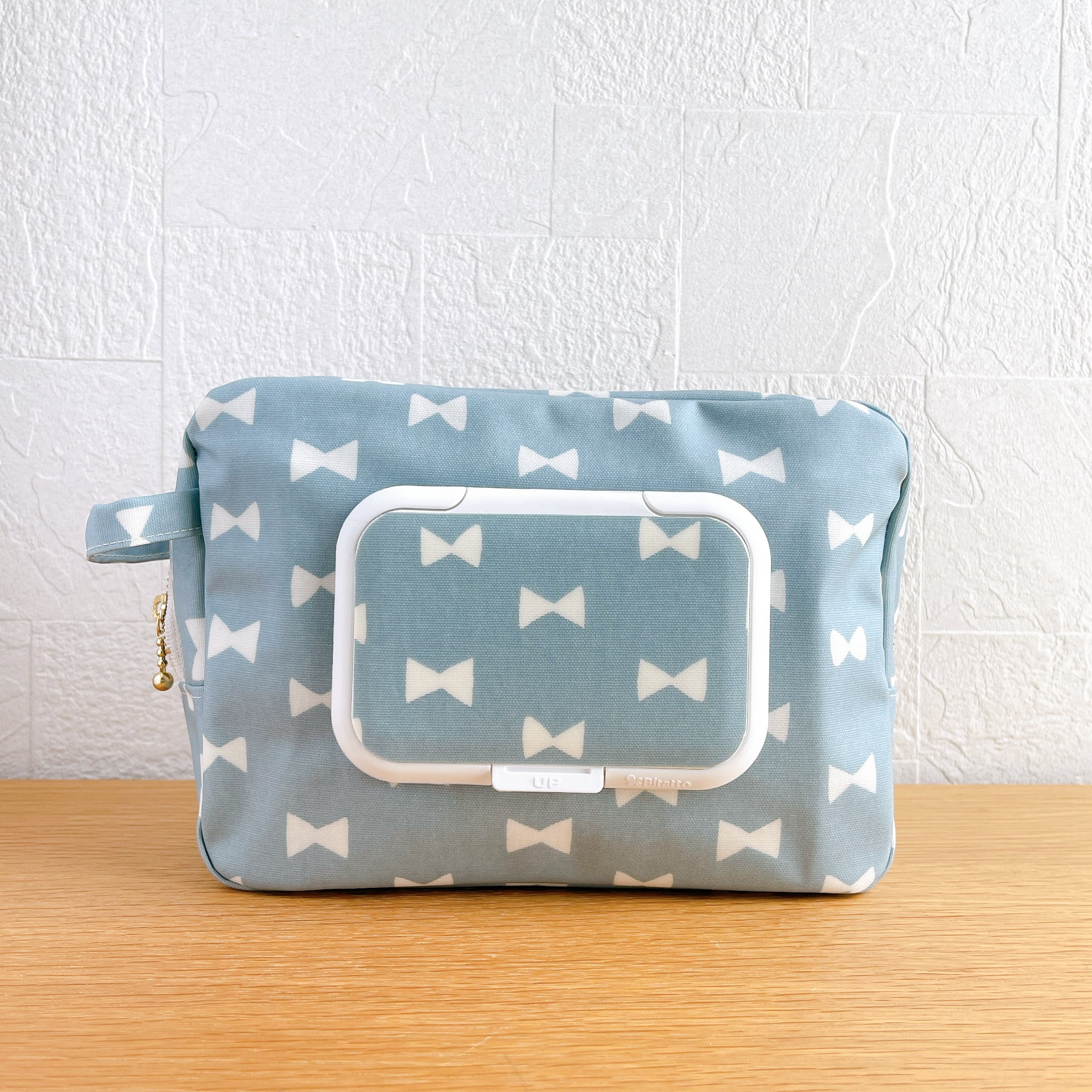 軽量!ビタット付きラミネートのおむつポーチ リボン くすみカラー ブルー 水色 オムツポーチ