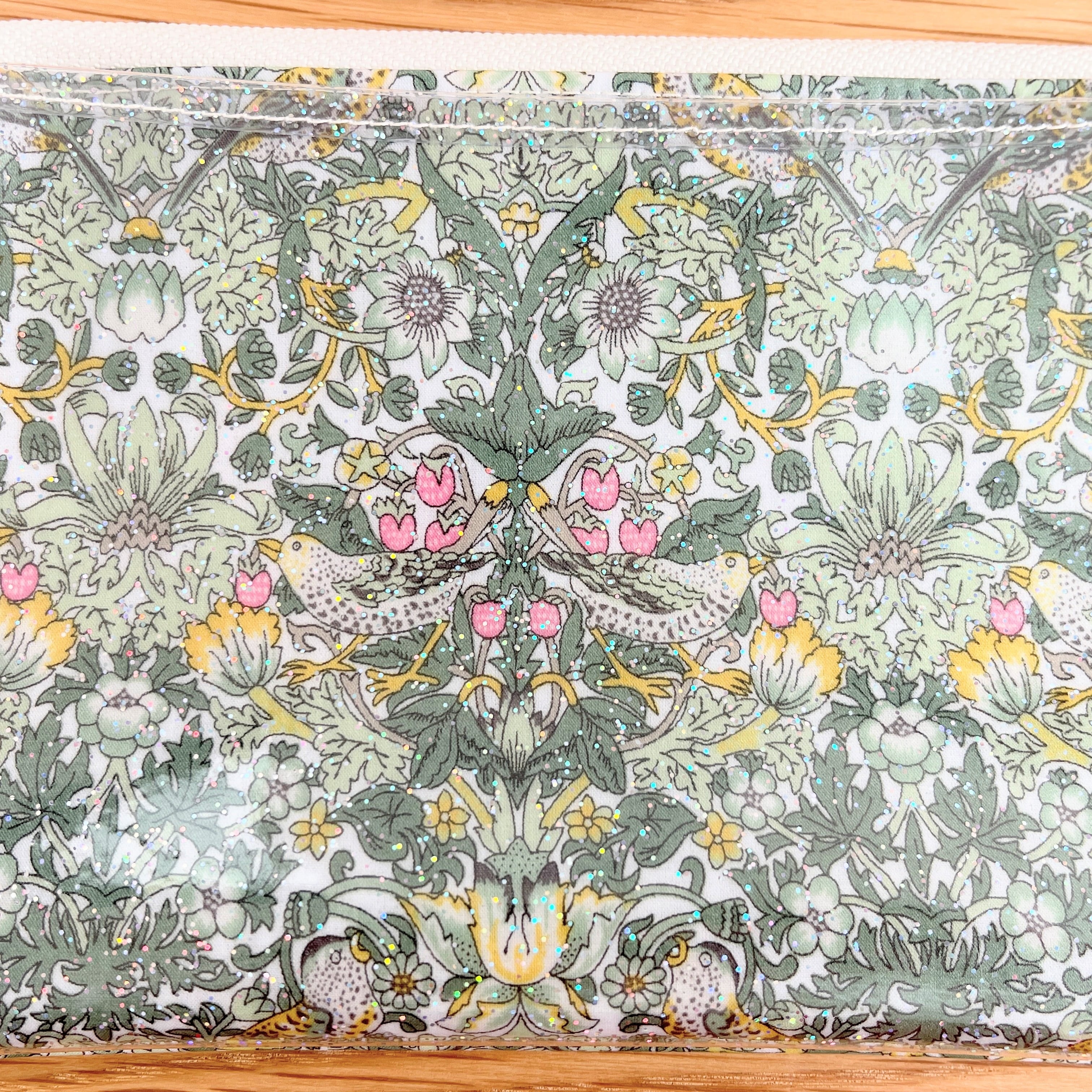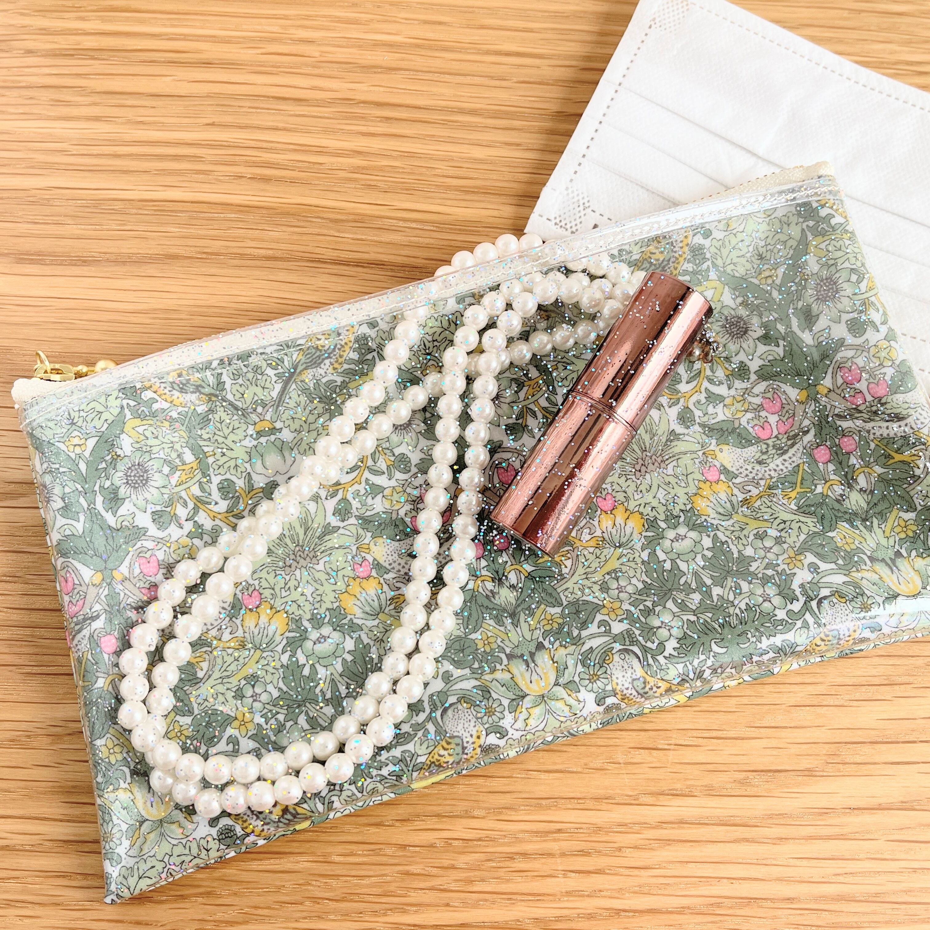 ママに便利なマスクポーチ☆ ウィリアム・モリス キラキララメ入り 透明ポケットがバッグの整理にお役立ち☆リバティ 苺泥棒 ストロベリーシーフ グリーン ラミネートのファスナーポーチ マスクポーチ