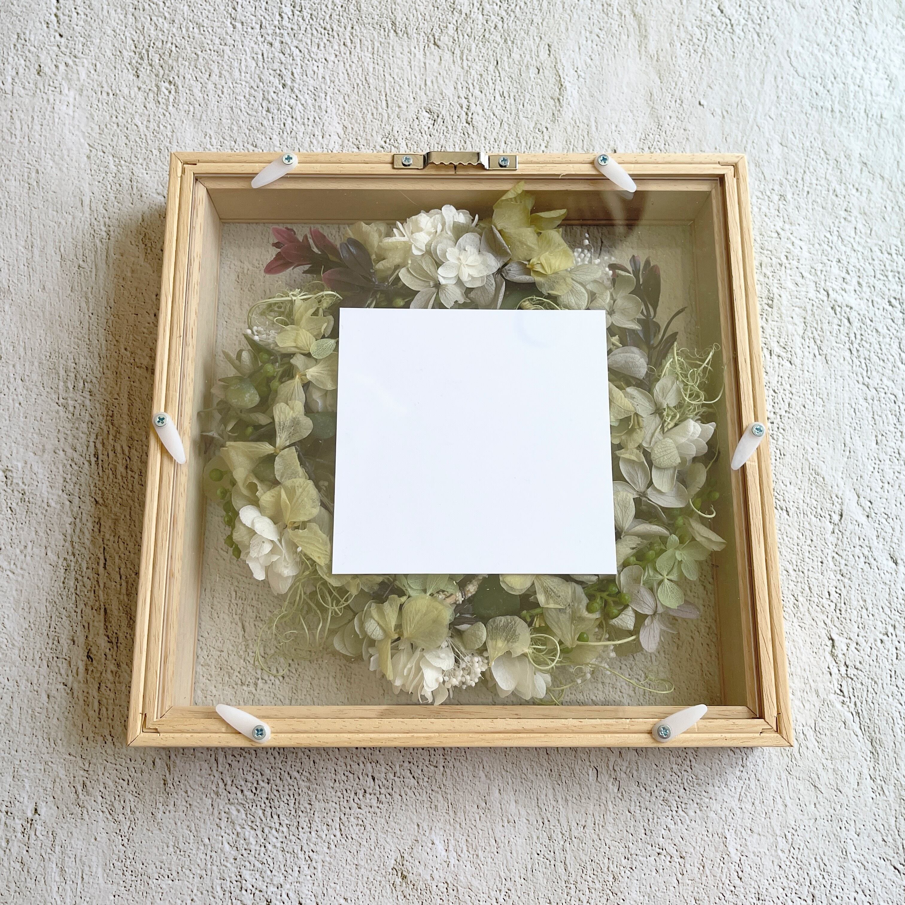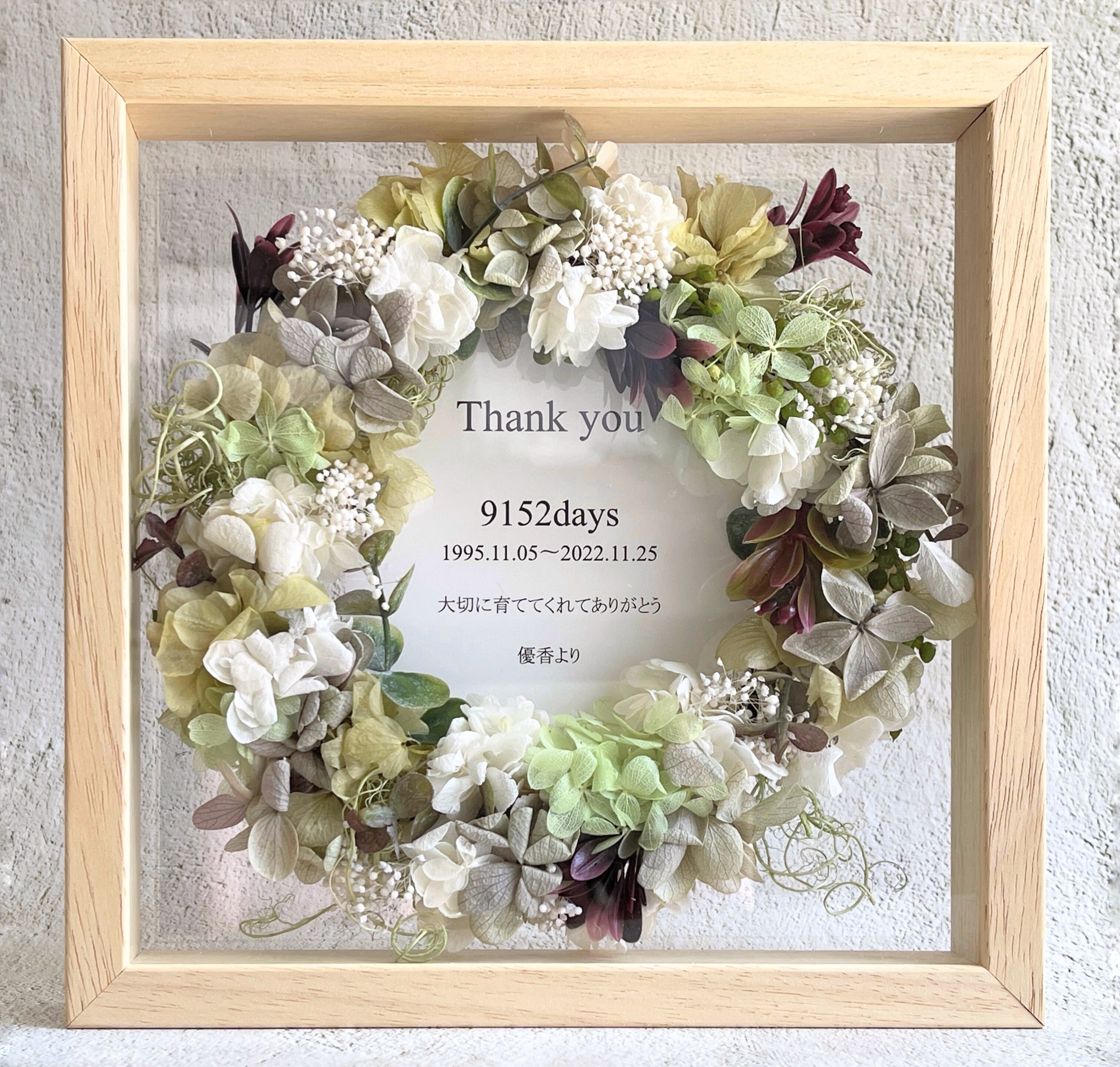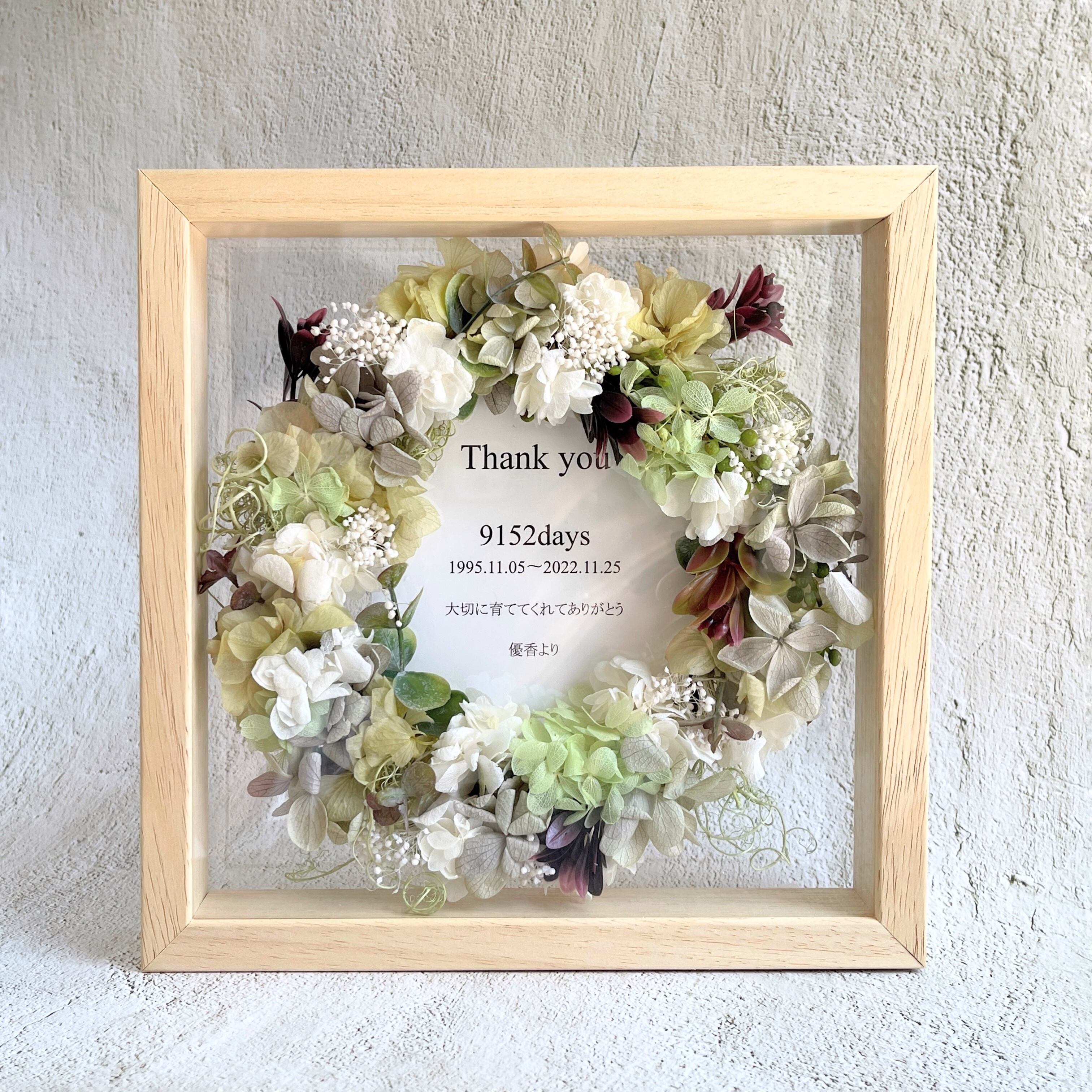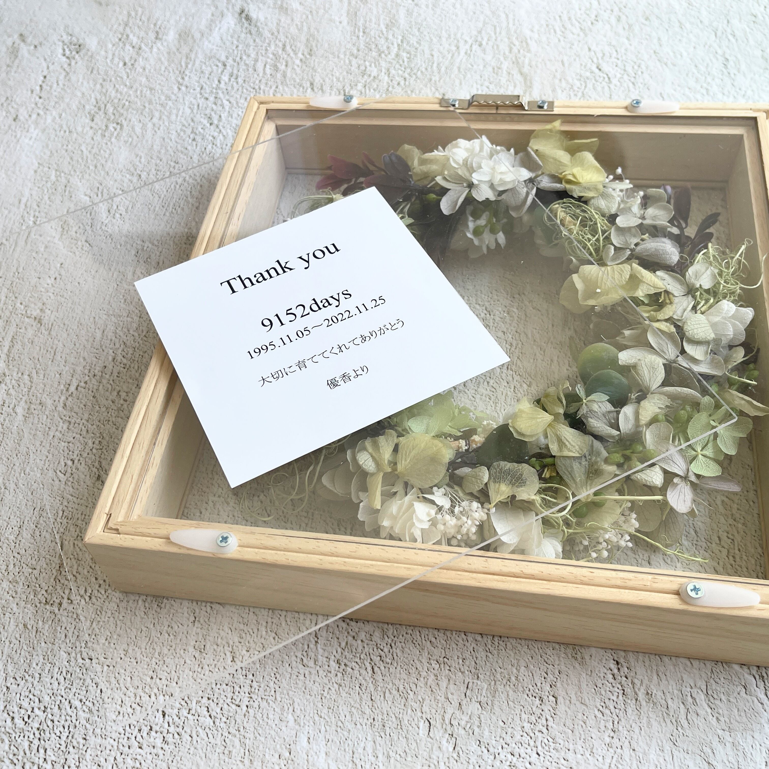 両面クリアのボックスにプリザーブドフラワーのリースをお入れした、世界にひとつだけのフォトボックスです。