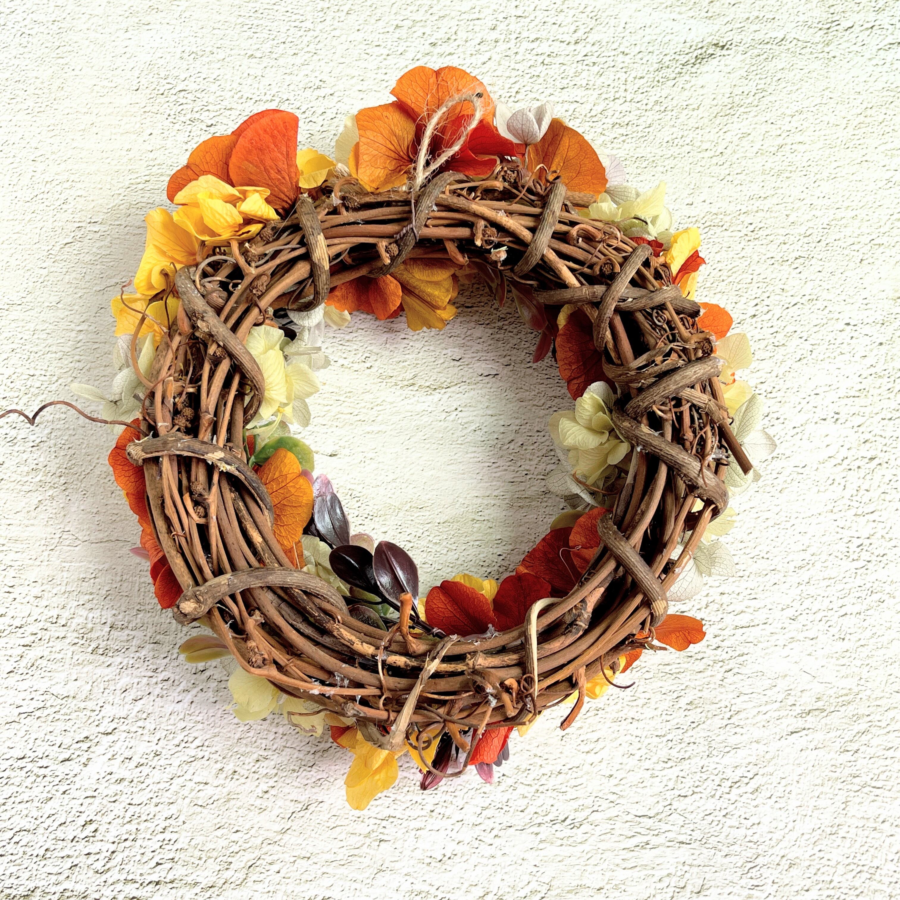 深いオレンジ色のアジサイを主役に、シックなリースに仕上げました。